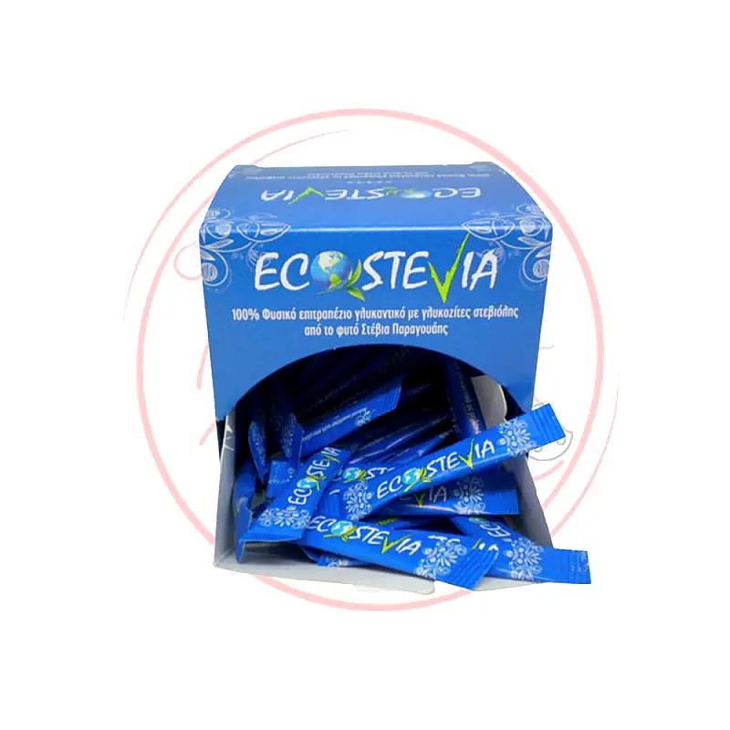 1 kesica stevie sadrži 1g, u odnosu 1:5, sto odgovara 1 kafenoj kašičici šećera. Eco Stevia je vodeći grčki brend 100% prirodnih zaslađivača dobijenih iz lista biljke STEVIA REBAUDIANA poreklom iz Paragvaja.Prirodni zaslađivač po sastavu i kristalnoj strukturi jedinstven na tržištu, idealan za dijete i dijabetičare, obzirom da ima nultu energetsku vrednost i nulti glikemijski indeks.